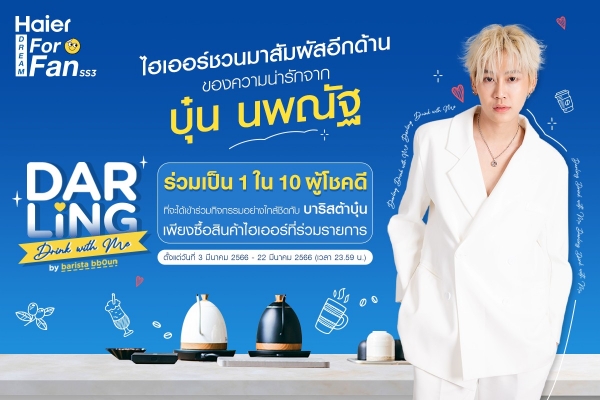 ไฮเออร์ แบรนด์เครื่องใช้ไฟฟ้าภายในบ้านอันดับ 1 ของโลกติดต่อกัน 14 ปีซ้อน จัดกิจกรรมไลฟ์แคมเปญ Haier Dream For Fan Season 3 โดยในครั้งนี้จะได้พบกับ “บุ๋น นพณัฐ กันทะชัย” ที่จะมาเป็นแขกสุดพิเศษในบทบาทบาริสต้าสุดหล่อ ในคอนเซปต์ Darling Drink with Me by barista bb0un ร่วมทำกิจกรรมผ่าน Live บน Facebook Haier Thailand ในวันที่ 31 มี.ค. 66 เวลา 19.00 น. เป็นต้นไป