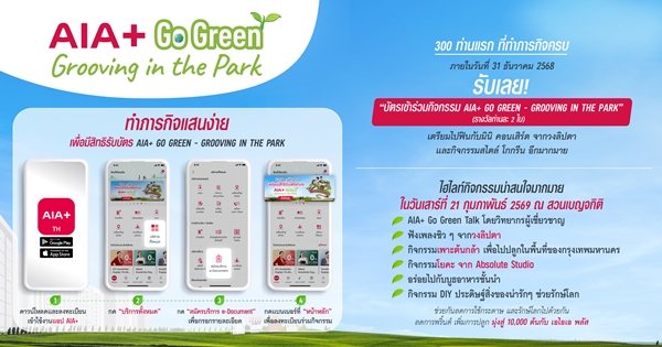 ร่วมเป็นส่วนหนึ่งของแคมเปญ AIA+ Go Green เพื่อร่วมกันรักษ์โลกและสร้างความยั่งยืนไปกับ เอไอเอ โดยการเปลี่ยนสู่ธุรกรรมอิเล็กทรอนิกส์ที่สะดวกและปลอดภัย เพียงดาวน์โหลดแอป AIA+ และสมัครรับบริการ E-Document และ E-Receipt ได้ตั้งแต่วันที่ 14 ตุลาคม – 31 ธันวาคม 2568 เพื่อมีสิทธิรับบัตร AIA+ Go Green – Grooving in the Park ในวันเสาร์ที่ 21 กุมภาพันธ์ 2569