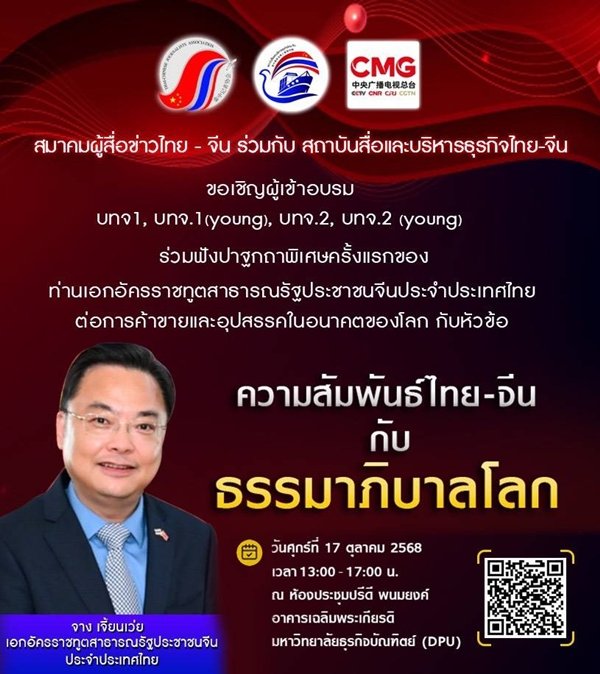 ทั้งนี้การปาฐกถาพิเศษนี้จัดขึ้นในวันศุกร์ที่ 17 ตุลาคม 2568 เวลา 13:00 – 17:00 น. ณ ห้องประชุมปรีดี พนมยงค์ อาคารเฉลิมพระเกียรติ มหาวิทยาลัยธุรกิจบัณฑิตย์ (DPU) โดยเปิดโอกาสให้ผู้สนใจทุกท่านเข้าร่วมรับฟัง เพื่อร่วมเฉลิมฉลองครบรอบ 50 ปี ความสัมพันธ์ทางการทูตไทย–จีน และร่วมกำหนดทิศทางอนาคตของความร่วมมือไทย–จีนบนพื้นฐานของความเข้าใจ ธรรมาภิบาล และสันติภาพที่ยั่งยืน