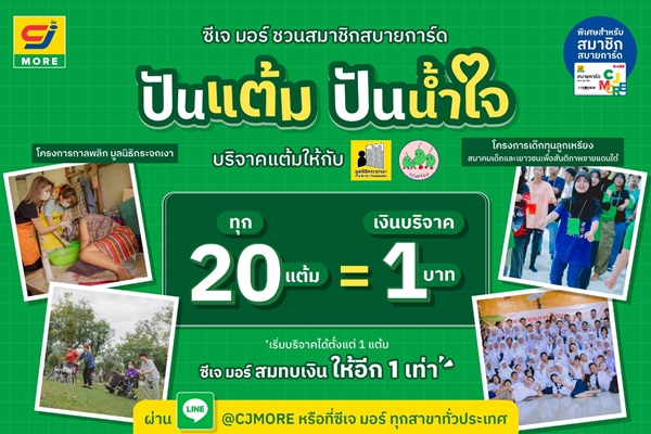 ร่วมเปลี่ยนแต้มเล็ก ๆ ให้เป็นพลังยิ่งใหญ่ “ปันแต้ม ปันน้ำใจ” กับซีเจ มอร์ ได้ตั้งแต่วันที่ 1 พฤศจิกายน ถึง 31 ธันวาคม 2568 เพราะทุกแต้มของคุณ คือโอกาสของใครอีกหลายคนที่จะได้เริ่มต้นใหม่ อย่างมีความหวังในสังคมที่ไม่ทิ้งใครไว้ข้างหลัง