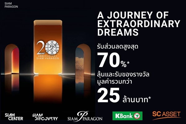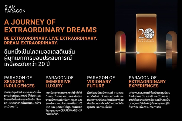 และในปีนี้  สยามพารากอนฉลองครบรอบ 20 ปีสุดยิ่งใหญ่ภายใต้แนวคิด “A Journey of Extraordinary Dreams” ผนึกกำลังทั้ง ศูนย์ฯ และห้างฯ มอบประสบการณ์เหนือระดับกับกิจกรรมสุดพิเศษ ระหว่างวันที่ 29-30 พ.ย. 2568 เนรมิตทุกตารางเมตร ตั้งแต่ชั้น B ถึงชั้น 5 ทุกชั้นทุกแผนกให้เป็นอาณาจักรแห่งความสุข หรรษา และสร้างแรงบันดาลใจให้แก่กลุ่มลูกค้าครอบคลุมทุกเป้าหมาย อาทิ