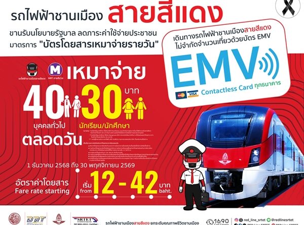 นายสุเทพ พันธุ์เพ็ง กรรมการผู้อำนวยการใหญ่ บริษัท รถไฟฟ้า ร.ฟ.ท. จำกัด ผู้ให้บริการรถไฟฟ้าชานเมืองสายสีแดง เปิดเผยว่า รฟฟท. พร้อมดำเนินการตามนโยบายรัฐบาล เพื่อช่วยลดภาระค่าใช้จ่ายให้แก่ประชาชน ”ดำเนินมาตรการ “บัตรโดยสารเหมาจ่ายรายวัน” สำหรับรถไฟชานเมืองสายสีแดง ทั้ง 2 เส้นทาง ได้แก่ สายธานีรัถยา ช่วงสถานีกลางกรุงเทพอภิวัฒน์ – สถานีรังสิต และสายนครวิถี ช่วงสถานีกลางกรุงเทพอภิวัฒน์ – สถานีตลิ่งชัน ร่วมกับ รถไฟฟ้ามหานคร สายฉลองรัชธรรม (MRT สายสีม่วง) โดยเตรียมจัดเก็บค่าโดยสารสูงสุด 40 บาท/วัน สำหรับประเภทบุคคลทั่วไป(Adult) และจัดเก็บค่าโดยสารสูงสุด 30 บาท/วัน สำหรับประเภทนักเรียน/นักศึกษา(Student) ซึ่งใช้บัตร MANGMOOM EMV บัตร EMV Contactless (บัตรเครดิต บัตรเดบิต) หรือ บัตร MRT EMV สำหรับเดินทางได้ทุกวัน ตั้งแต่เปิดให้บริการจนถึงปิดให้บริการ(05.00 – 24.00 น.) ซึ่งนโยบายดังกล่าวจะเริ่มใช้ตั้งแต่ วันที่ 1 ธันวาคม 2568 – 30 พฤศจิกายน 2569 หากผู้ใช้บริการมีการเดินทางในอัตราค่าโดยสารรวมทั้งวันต่ำกว่าอัตราเหมาจ่ายรายวัน จะจัดเก็บค่าโดยสารตามจริง และสำหรับกลุ่มผู้พิการ ผู้สูงอายุ เด็ก รวมถึงกลุ่มผู้ใช้สิทธิ์สวัสดิการแห่งรัฐ ยังคงได้รับส่วนลด หรือยกเว้นค่าโดยสารตามสิทธิประโยชน์เช่นเดิม