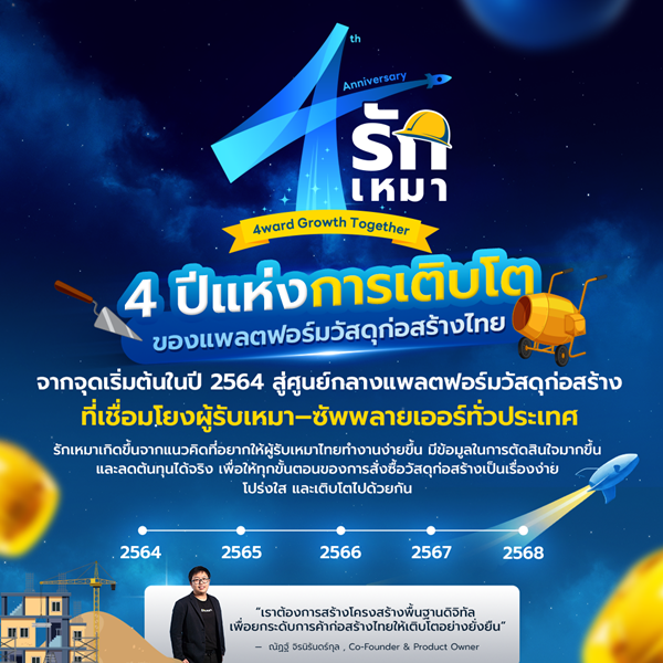 “รักเหมา” แพลตฟอร์มดิจิทัลด้านวัสดุก่อสร้างของไทย เฉลิมฉลองครบรอบ 4 ปีแห่งการเติบโต ภายใต้แนวคิด “4WARD Growth Together” สื่อถึงการก้าวไปข้างหน้าอย่างมั่นคงร่วมกับผู้รับเหมาไทยและเครือข่ายร้านค้าวัสดุก่อสร้าง ด้วยเทคโนโลยีที่ “ฉลาดขึ้น ง่ายขึ้น ประหยัดขึ้น และไวขึ้น (Smarter, Simpler, Saver, Speed)” ตอกย้ำจุดยืนของแบรนด์ในฐานะ “เพื่อนคู่คิดของทั้งผู้รับเหมาและเครือข่ายผู้ขายวัสดุก่อสร้างไทย” ที่มุ่งสร้างระบบนิเวศการก่อสร้างแบบสองฝั่งให้เติบโตอย่างยั่งยืนไปด้วยกัน คาดมูลค่าการซื้อ-ขายผ่านแพลตฟอร์ม (GMV) ปี 2568 จะมีมูลค่า 1,380 ล้านบาท เติบโตกว่า 30%