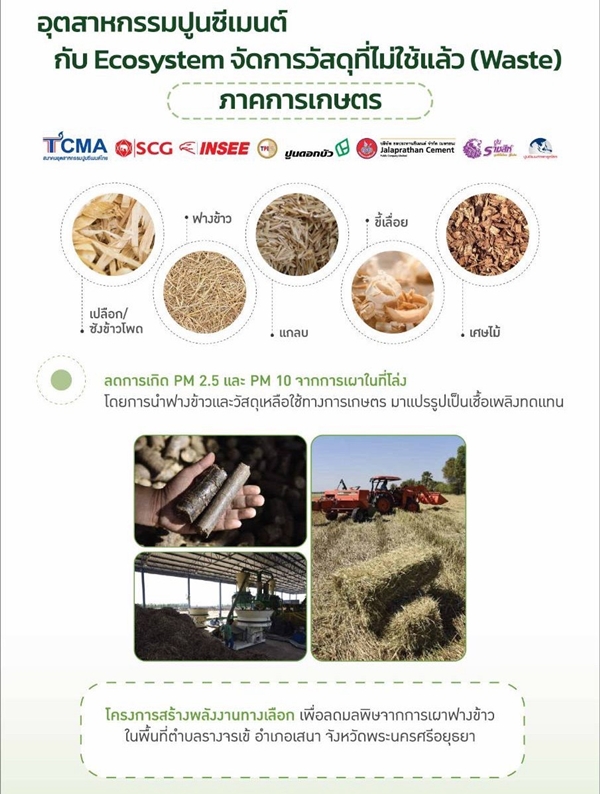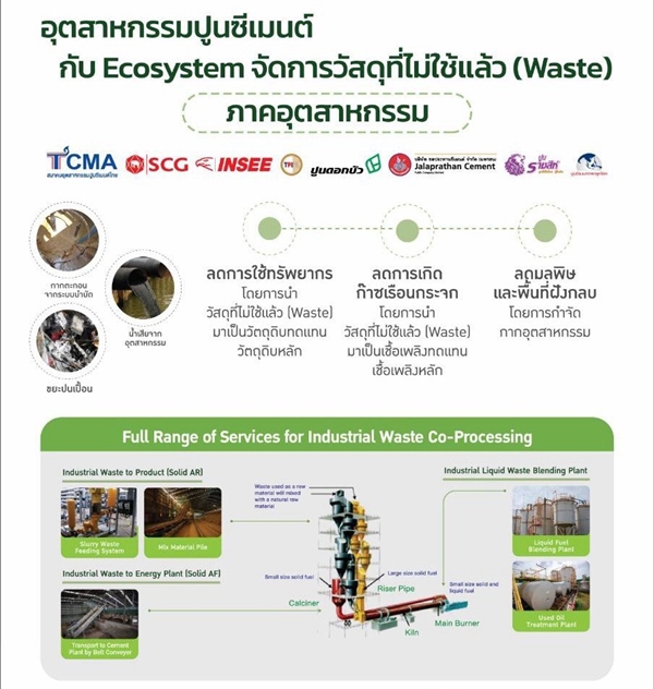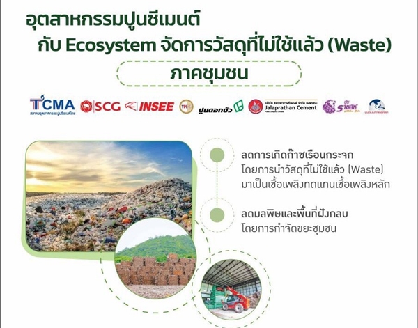 สำหรับประเทศไทย การจัดการวัสดุเหลือใช้จากภาคเกษตร อุตสาหกรรม และชุมชนยังเป็นความท้าทายสำคัญ ขณะที่อุตสาหกรรมปูนซีเมนต์มีศักยภาพโดดเด่นด้านเทคโนโลยีในการนำวัสดุเหล่านี้เข้าสู่กระบวนการเผาร่วมในเตาเผาปูนซีเมนต์ที่มีอุณหภูมิสูงกว่า 1,450 องศาเซลเซียส TCMA จึงเดินหน้าผลักดัน Co-Processing เพื่อกำจัดวัสดุไม่ใช้แล้วอย่างปลอดภัย เป็นมิตรต่อสิ่งแวดล้อม ไม่ก่อมลพิษ ลดฝุ่น PM2.5 เพิ่มรายได้ให้เกษตรกร ลดภาระพื้นที่ฝังกลบ และลดการปล่อยก๊าซเรือนกระจกได้อย่างมีประสิทธิภาพ