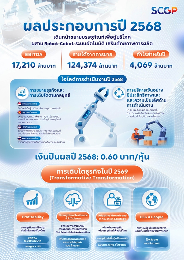 นอกจากนี้ SCGP ได้นำระบบอัตโนมัติ (Automation) เทคโนโลยีหุ่นยนต์ (Robot) และหุ่นยนต์เพื่อทำงานร่วมกับพนักงาน (Cobot) รวมทั้ง ระบบปัญญาประดิษฐ์ (Artificial Intelligence: AI) มาใช้ในกระบวนการผลิต เพื่อเพิ่มความแม่นยำในการควบคุมคุณภาพบรรจุภัณฑ์ ลดต้นทุน ตลอดจนช่วยในการจัดการวัตถุดิบ และส่งมอบสินค้าที่ได้คุณภาพให้ลูกค้า โดยจะขยายการใช้งานไปยังโรงงานในต่างประเทศต่อไป อีกทั้งยังเดินหน้าบริหารต้นทุนต่อเนื่อง เช่น ธุรกิจในอินโดนีเซียได้ปรับสัญญาการใช้พลังงาน ซึ่งจะเริ่มเห็นผลการลดค่าใช้จ่ายตั้งแต่เดือนมกราคม 2569 ทั้งนี้ SCGP วางแผนเพิ่มสัดส่วนการใช้พลังงานทางเลือกเป็นร้อยละ 40 จากร้อยละ 38 เพื่อลดการปล่อยก๊าซเรือนกระจก สอดคล้องกับการดำเนินงานภายในกรอบ ESG พร้อมลดต้นทุนโดยรวมของบริษัทฯ 600 ล้านบาทในปี 2569