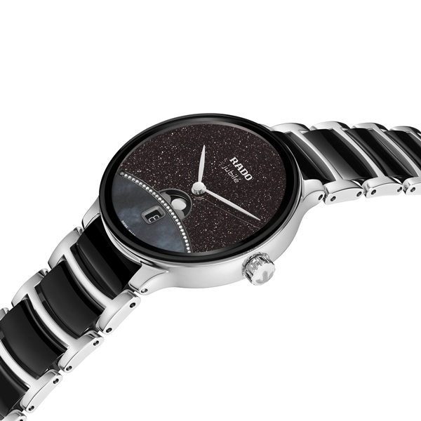 อีกส่วนหนึ่งของหน้าปัดรังสรรค์จากหินอะเวนทูรีน ซึ่งให้ประกายระยิบระยับราวกับหมู่ดาวที่กระจายอยู่ทั่วกาแล็กซี เหนือเส้นขอบฟ้า คือฟังก์ชันแสดงข้างขึ้นข้างแรม ซึ่งถือเป็นครั้งแรกที่ Rado นำฟังก์ชันนี้มาใช้กับคอลเลกชัน Centrix โดยดวงจันทร์ได้รับการรังสรรค์ด้วยโรเดียม เพื่อให้กลมกลืนกับเข็มชั่วโมงและเข็มนาที ถ่ายทอดวัฏจักรของดวงจันทร์อย่างงดงาม ตั้งแต่ข้างขึ้นจนถึงข้างแรมในแต่ละเดือน สะท้อนความลุ่มลึกและ แรงบันดาลใจจากเรื่องเล่าแห่งพันหนึ่งราตรี