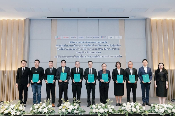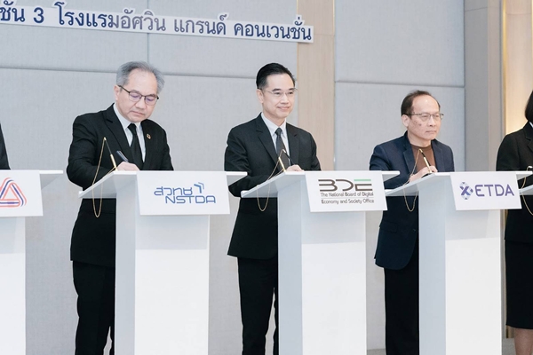 นอกจากนี้ การประชุมสัมมนาเพื่อเผยแพร่ผลการศึกษาของโครงการฯ ยังได้มีพิธีลงนามบันทึกข้อตกลง ความร่วมมือ (MOU) การส่งเสริมและสนับสนุนการเปลี่ยนผ่านนวัตกรรม AI ไปสู่องค์กร ภายใต้กรอบแนวทางการเปลี่ยนผ่านนวัตกรรม AI ของอาเซียน จำนวน 9 หน่วยงาน ได้แก่ 1) สำนักงานคณะกรรมการดิจิทัลเพื่อเศรษฐกิจและสังคมแห่งชาติ 2) สำนักงานพัฒนาวิทยาศาสตร์และเทคโนโลยีแห่งชาติ 3) สำนักงานพัฒนาธุรกรรมทางอิเล็กทรอนิกส์ 4) สภาอุตสาหกรรมแห่งประเทศไทย 5) สภาดิจิทัลเพื่อเศรษฐกิจและสังคมแห่งประเทศไทย 6) สมาคมอุตสาหกรรมซอฟต์แวร์ไทย 7) มูลนิธิเพื่อการพัฒนาดิจิทัล 8) บริษัท กสิกร แล็บส์ จำกัด และ 9) บริษัท ปูนซิเมนต์ไทย จำกัด (มหาชน) โดยมีวัตถุประสงค์เพื่อส่งเสริมและสนับสนุนให้เกิดการนำกรอบแนวทางการเปลี่ยนผ่านนวัตกรรม AI ของอาเซียน มาใช้ในการเปลี่ยนผ่านนวัตกรรม AI ขององค์กร และการพัฒนาบุคลากรไทยให้มีความพร้อมในการใช้และพัฒนา AI รวมถึงสร้างเครือข่ายความร่วมมือการพัฒนากรอบแนวทางการเปลี่ยนผ่านนวัตกรรม AI ของอาเซียน ให้รองรับการปรับเปลี่ยนทางด้าน AI และกรอบความตกลงที่เกี่ยวข้องภายใต้ประชาคมอาเซียน ทั้งยังเป็นการร่วมกันแบ่งปัน และเผยแพร่ความรู้ ประสบการณ์การนำ AI มาใช้ในองค์กรอย่างเหมาะสมและปลอดภัย