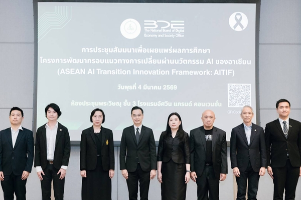 วันนี้ (4 มีนาคม 2569) นายเวทางค์ พ่วงทรัพย์ เลขาธิการคณะกรรมการดิจิทัลเพื่อเศรษฐกิจและสังคมแห่งชาติ (BDE) เป็นประธานการประชุมสัมมนาเพื่อเผยแพร่ผลการศึกษาโครงการพัฒนากรอบแนวทางการเปลี่ยนผ่านนวัตกรรม AI ของอาเซียน (ASEAN AI Transition Innovation Framework : AITIF) พร้อมด้วยนางสาวพรพรรณ ตันนุกิจ ผู้อำนวยการกองขับเคลื่อนดิจิทัลเพื่อเศรษฐกิจ BDE กล่าวรายงานวัตถุประสงค์ของการจัดงาน โดยมีผู้แทนจากหน่วยงานภาครัฐ ภาคเอกชน/รัฐวิสาหกิจ และสถาบันการศึกษา ณ ห้องประชุมพระวิษณุ ชั้น 3 โรงแรมอัศวิน แกรนด์ คอนเวนชั่น หลักสี่ กรุงเทพฯ