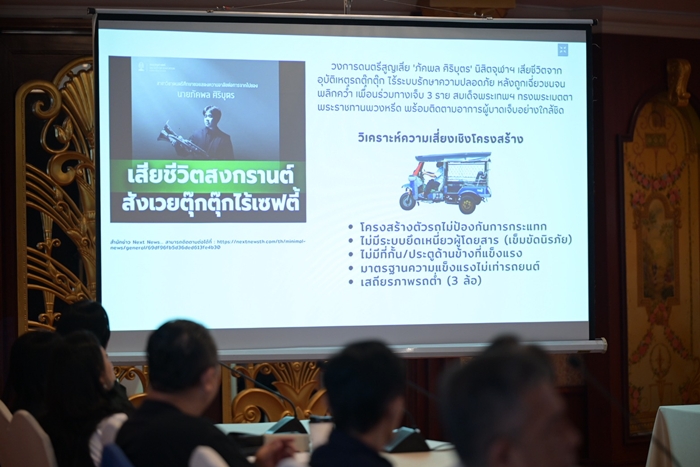 “ก่อนเทศกาลสงกรานต์ 2 วัน มีผู้เสียชีวิตจากอุบัติเหตุทางถนนถึง 102 ราย เมื่อเจาะลึกด้านเพศและวัย พบว่า 67.86% เป็นเพศชาย กลุ่มอายุที่เกิดอุบัติเหตุสูงสุดคือเด็กและเยาวชน 0–24 ปี (23.57%) รองลงมาคือวัยทำงาน 20–29 ปี (22.14%) ข้อมูลจากบริษัทกลางคุ้มครองผู้ประสบภัยจากรถ จำกัด ระบุว่า 38% ของผู้เสียชีวิตเป็นหัวหน้าครอบครัว และอีก 62% เป็นสมาชิกในครอบครัว นอกจากนี้ ยังพบว่า 83% เสียชีวิตในพื้นที่ตำบลหรืออำเภอของตนเอง และ 88% เสียชีวิตบนเส้นทางประจำ โดย 32% เสียชีวิตในระยะ 2–5 กิโลเมตรจากบ้าน และ 29% ในระยะ 6–10 กิโลเมตร สอดคล้องกับข้อค้นพบว่า ‘ใกล้บ้านไม่สวมหมวกนิรภัย ไม่มีใบขับขี่’ เป็นสาเหตุสำคัญของการเสียชีวิต โดยเฉพาะในกลุ่มเด็กและเยาวชน เสนอให้สื่อมวลชนสร้างมิติใหม่ของการสื่อสารเพื่อปรับเปลี่ยนพฤติกรรม โดยเปิดโอกาสให้ประชาชนมีส่วนร่วมในการเล่าประสบการณ์จริงหรือความผิดพลาดที่เกิดขึ้น พร้อมแสวงหาแนวร่วมใหม่ ๆ ในการจัดการความเสี่ยงด้านความปลอดภัยทางถนน” นพ.ธนะพงศ์ กล่าว