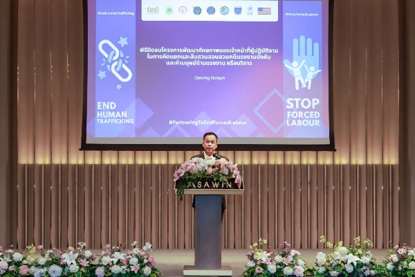 นายสิบหมื่นชัย โพธิสินธุ์ ผู้ตรวจราชการกระทรวงแรงงาน สำนักงานปลัดกระทรวงแรงงานกระทรวงแรงงาน ประธานในพิธีเปิด ได้กล่าวถึงความสำคัญของการยกระดับนโยบายและการทำงานร่วมกันระหว่างหน่วยงาน เพื่อเสริมสร้างความแข็งแกร่งให้กับระบบคุ้มครองแรงงานของประเทศไทย ซึ่งความสำเร็จในครั้งนี้เกิดขึ้นจากการทำงานเชิงบูรณาการร่วมกับ มูลนิธิไอเจเอ็ม และ ภาคีเครือข่ายสำคัญ ได้แก่ กระทรวงแรงงาน, สำนักงานคดีค้ามนุษย์ สำนักงานอัยการสูงสุด, สำนักงานตำรวจแห่งชาติ, กระทรวงการพัฒนาสังคมและความมั่นคงของมนุษย์, กรมสอบสวนคดีพิเศษ, กรมประมง และกรมการปกครอง